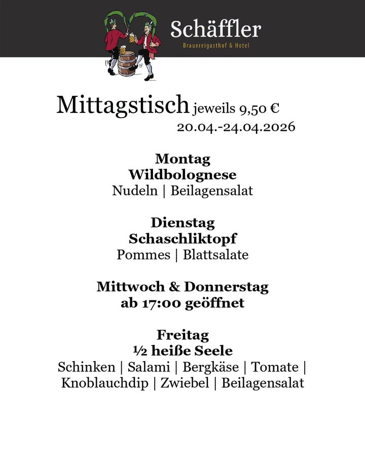 Mittagstisch für die folgende Woche für je 9,50€. Montag gibt es Wildbolognese mit Nudeln und einem Beilagensalat Dienstag gibt es Schaschliktopf mit Pommes und einem grünen Salat Mittwoch & Donnerstag sind wir ab 17:00 für Euch da Freitag gibt eine 1/2 heiße Seele belegt mit Schinken, Salami, Tomate, Bergkäse und Zwiebel dazu einen Knoblauchdip und Beilagensalat Wir freuen uns auf Euren Besuch!? ALLES IN EINEM. ALLES ECHT. Gasthof. Hotel. Brauerei.