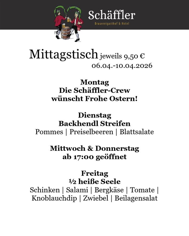 zum BeitragMittagstisch für die folgende Woche für je 9,50€. Ostermontag wünschen wir Euch einen schönen Feiertag Dienstag gibt es Backhendl streifen mit Pommes und Blattsalate dazu Preiselbeeren Mittwoch & Donnerstag sind wir ab 17:00 für Euch da Freitag gibt eine 1/2 heiße Seele belegt mit Schinken, Salami, Tomate, Bergkäse und Zwiebel dazu einen Knoblauchdip und Beilagensalat Wir freuen uns auf Euren Besuch!? ALLES IN EINEM. ALLES ECHT. Gasthof. Hotel. Brauerei.